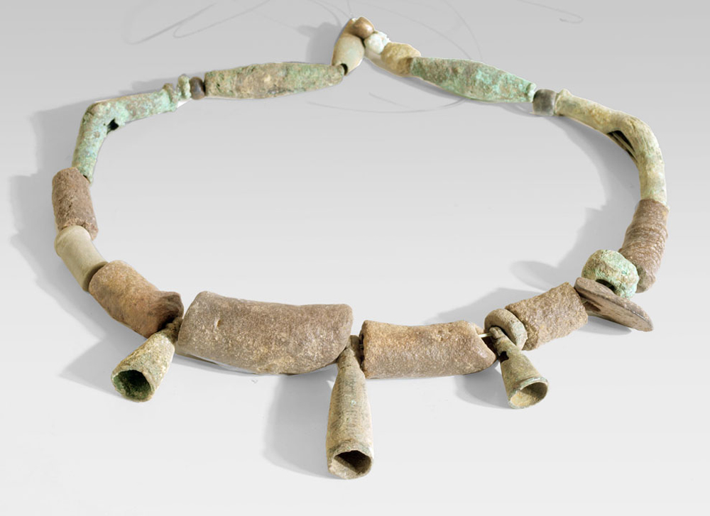 A necklace of neolithic objects, broze, terracotta and stones collected in the Sahara of Niger.