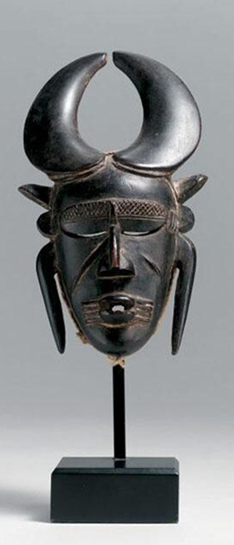 A Senufo Jimini bronze spoon with a miniature mask in the typical stylistic shape of the mask-style of this ethnic group; partly oxidised patina. s. Schaedler, Earth and Ore, page 98 - 101 with other examples of the mask-like decorations of this type of spoons.